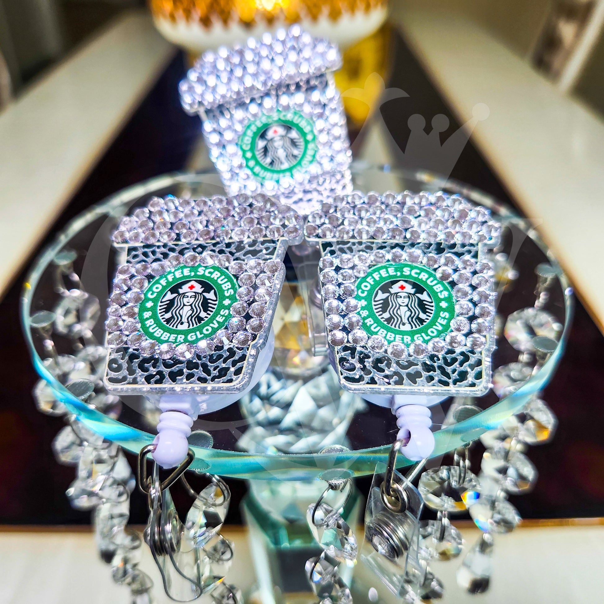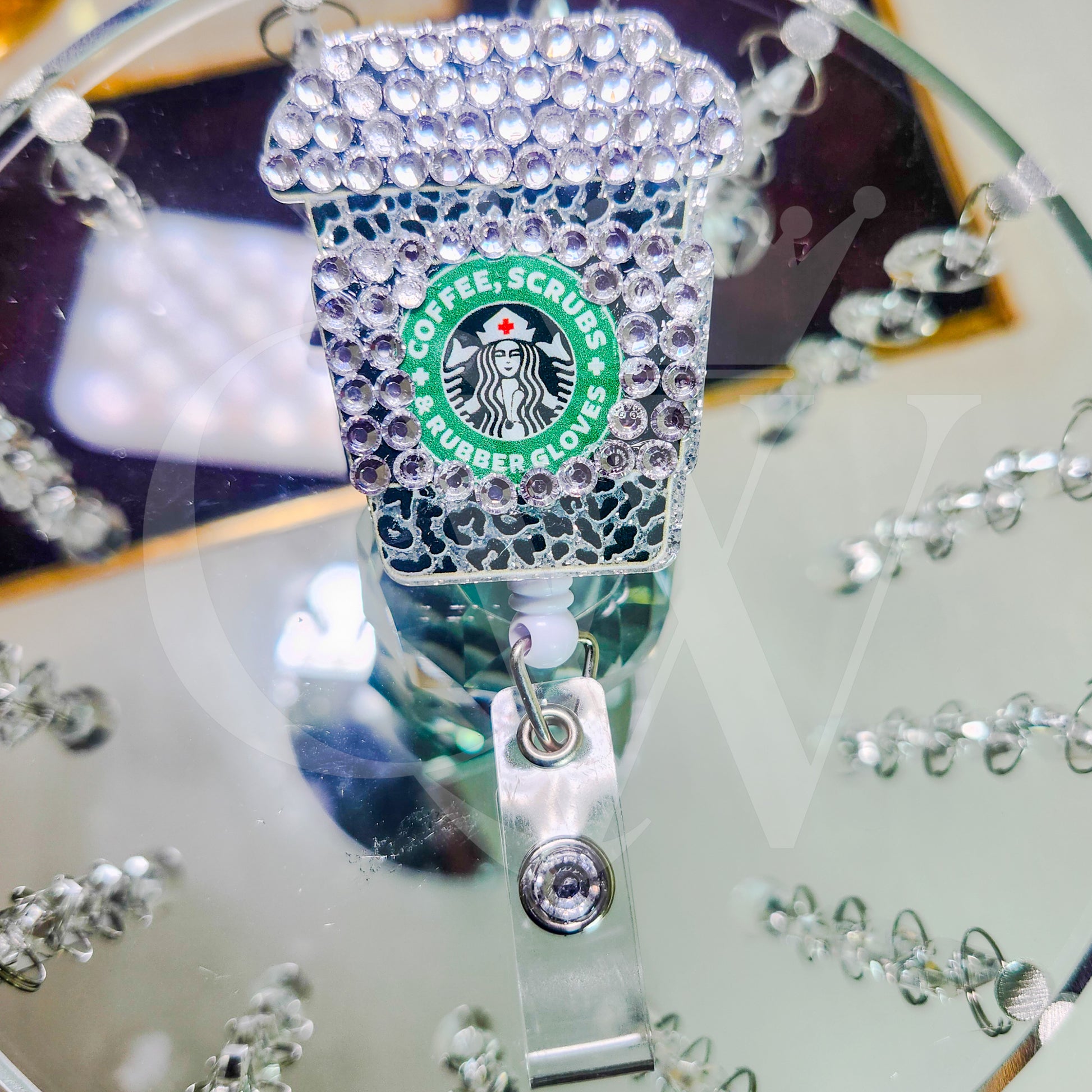 Silver rhinestone coffee badge holder.