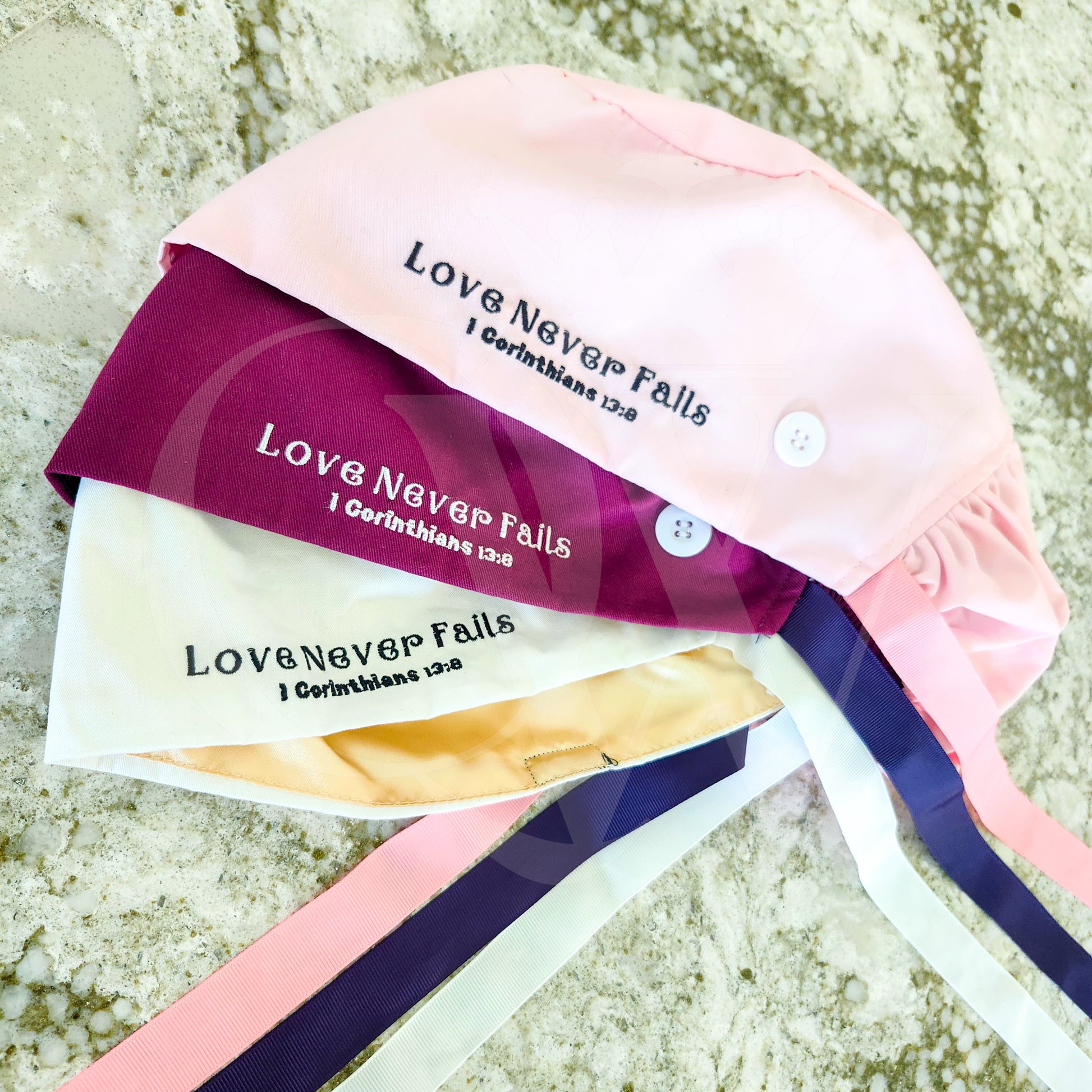"Love Never Fails" Silk Lining Bonnet Scrub Hats